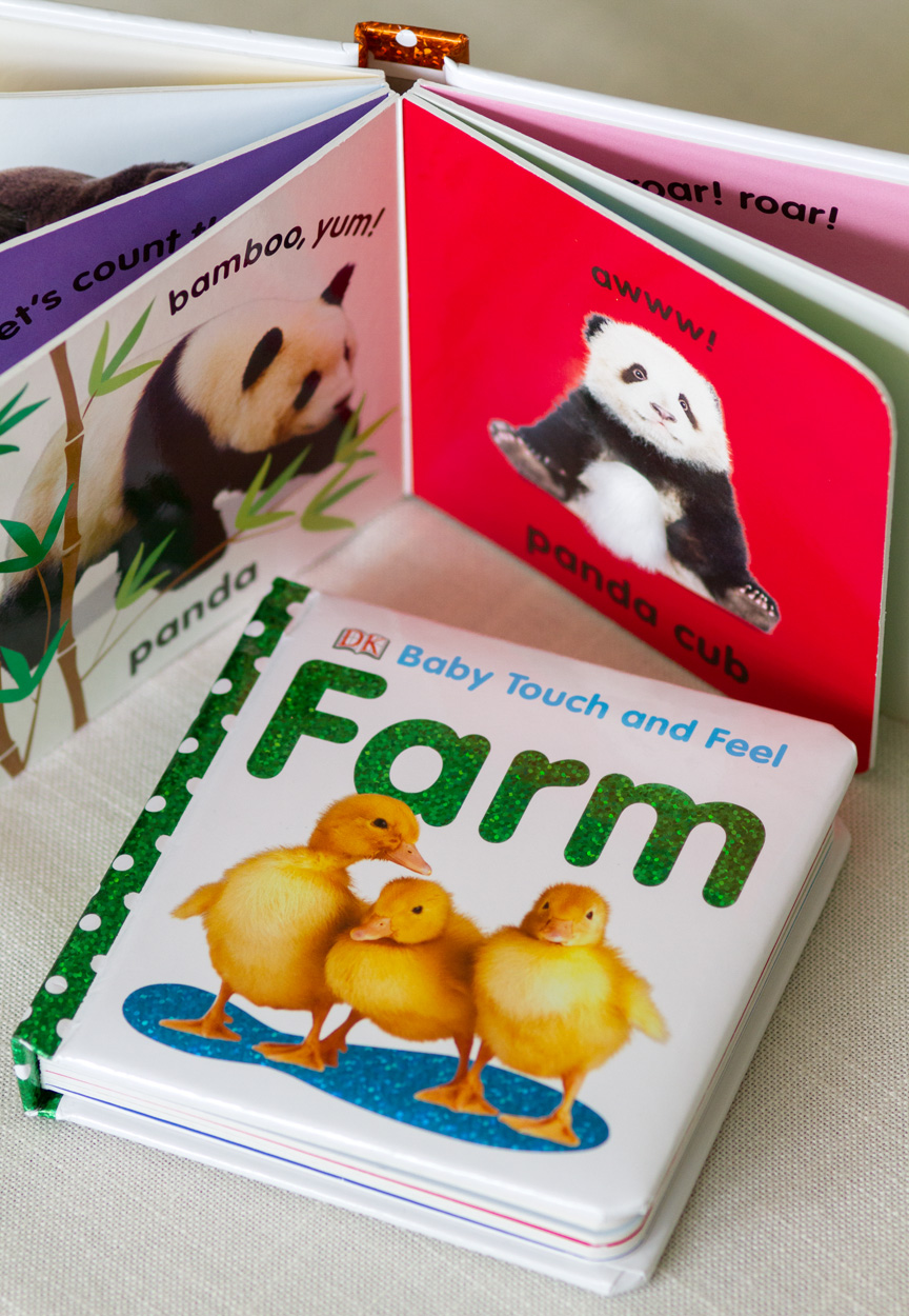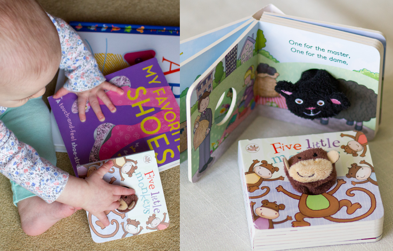 For the first few months I would read to my daughter in her crib: sometimes to get her to fall asleep, other times for the entertainment (think Dr. Seuss). Eventually, though, she began reaching for the books. She’s currently nine months old, and very skilled with her hands. Books that she can interact with via touch are now her favorites!
