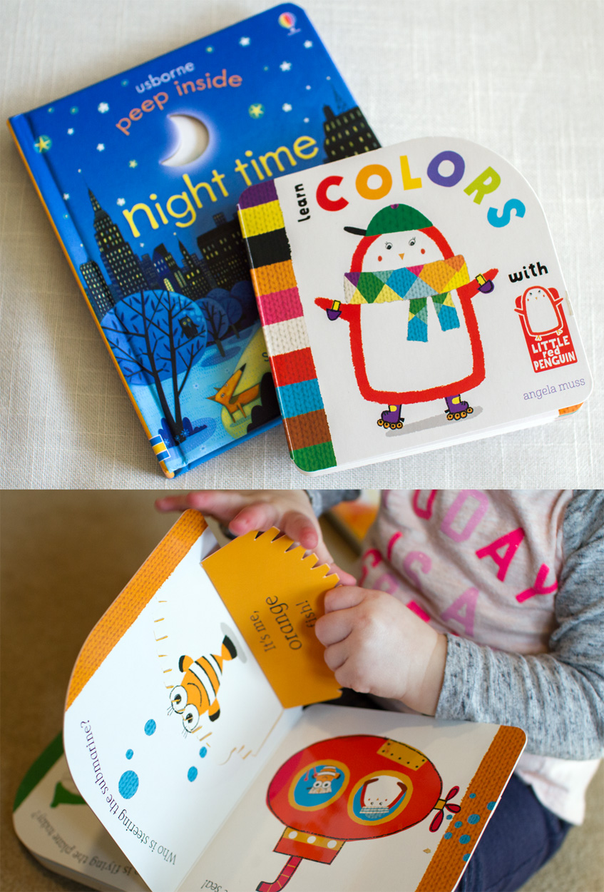 Chances are good that you’re already familiar with Usborne, the direct-sales company, from your friends’ online parties. While I love the idea behind direct-sales (making money for your friends), I just don’t buy much for myself. Again, children’s books are my exception! These books with flaps are just the coolest thing at my daughter’s age (9 mo+). Search for “Little Red Penguin” or “Peek Inside”.