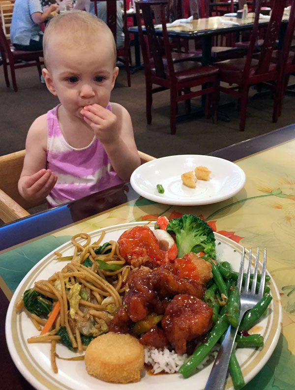 My husband and I absolutely loved going out to eat — before becoming parents. The first few months I couldn’t handle baby crying in her carseat at restaurants. Once she started sitting with us in a high chair, she insisted on throwing anything she could get her hands on. Meals out became infinitely more enjoyable once she was eating finger foods! She much prefers eating what we’re eating, and that makes everyone happy.