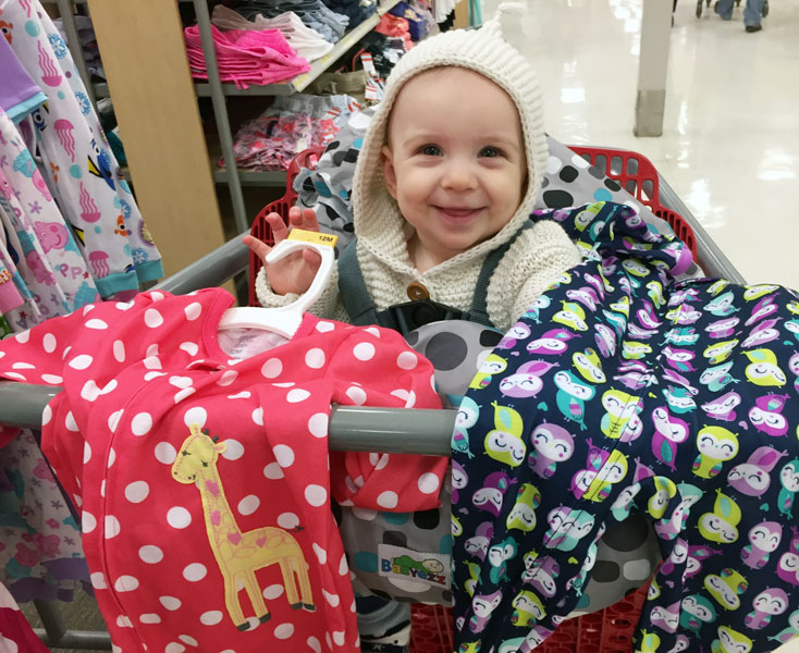 So now baby likes riding in the car, but what about hanging out in a shopping cart while you diligently compare sale prices? I knew I had a narrow window of time for shopping before my daughter would cause a scene in the store. But gradually, I noticed that she was enjoying these excursions. On one particularly cold day, she seemed ecstatic to pick out new pajamas! That’s when I knew that we could share in the love of consumerism.
