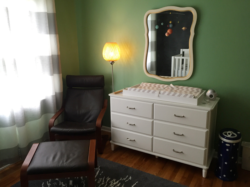 Nurseries can be bold and bright, too! Plenty of themes work for either a boy or a girl. Searching online using the word “neutral” brought up too many bland results for my taste. Finally my husband and I just went on The Land of Nod and scrolled through their designs until we came upon one we agreed on: Outer Space! Then we looked through paint samples until I found a shade of green I was in love with, and we decided a chalkboard wall would also work well with our theme.