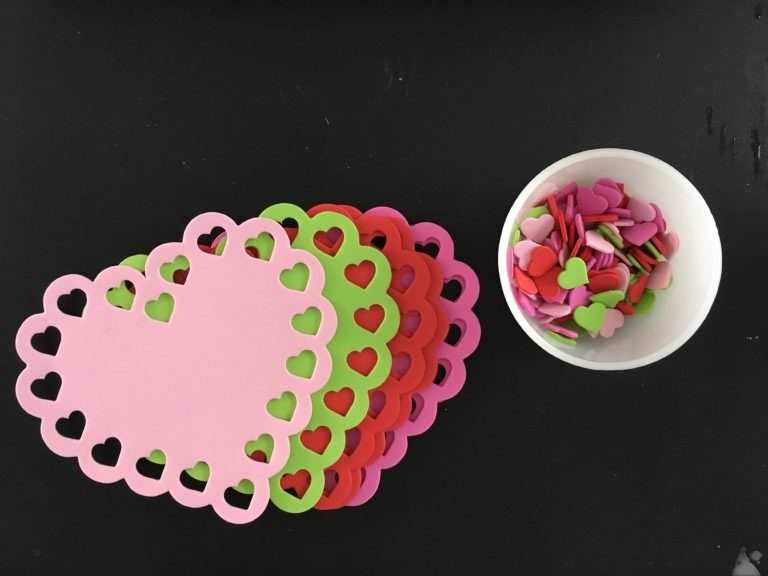 Now, I know that foam hearts are not something that everyone has just lying around the house like we do (#teachermom) but I had grabbed these on super clearance last year after Valentine’s Day was over. They are AWESOME because they served so many purposes in our crafting and also we will be able to use them for many years to come because there are seriously SO MANY.