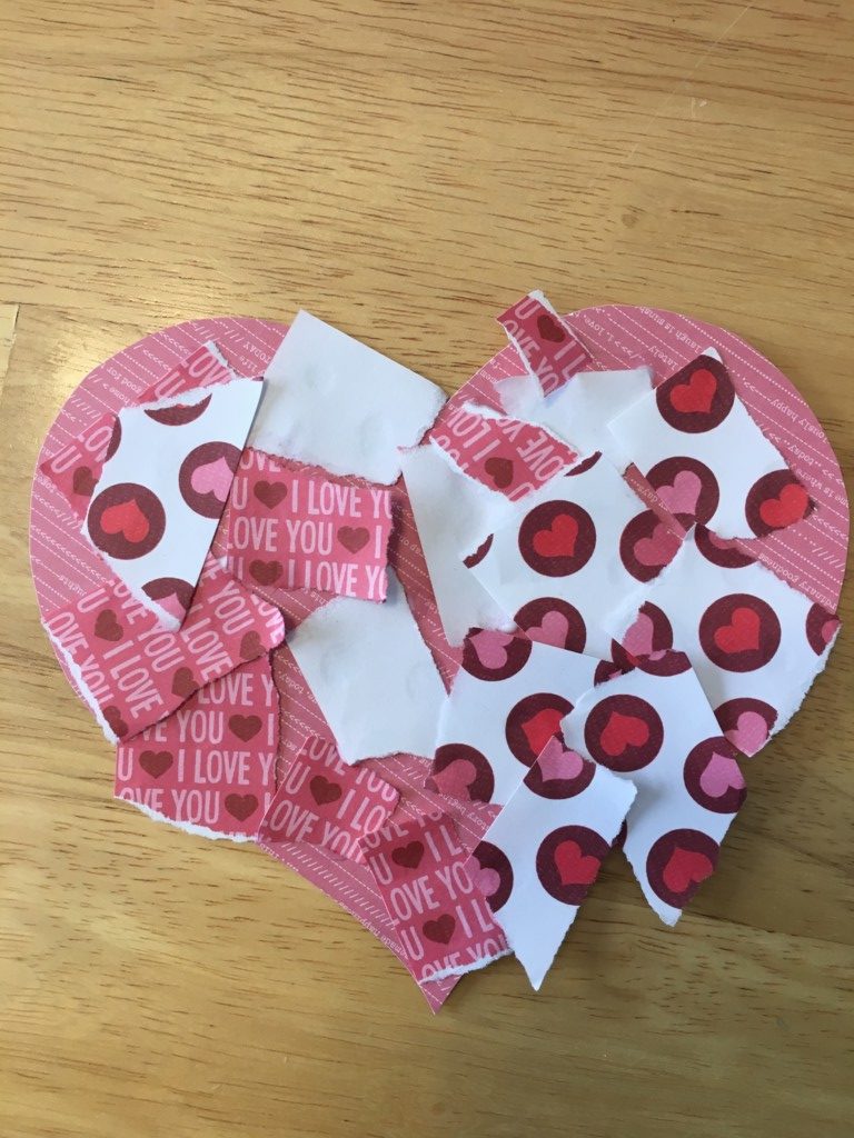 This is simple; tear and glue little pieces of scrap paper on to a heart. I chose to use scrapbook paper just to give the craft a little more depth and texture but you could use simple construction paper as well!