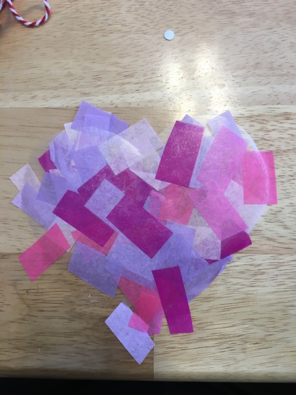 For our next craftivity I cut a heart out of contact paper and cut up pieces of tissue paper. You can use any kind of tissue paper! Even your Christmas tissue paper will work just fine. After you peel off the back of the contact paper allow your little to scatter the tissue paper all over the back of the sticky side of the paper. After they have filled it or just decide that they are done with the craft you can go back and trim the edges to sharpen the heart shape.