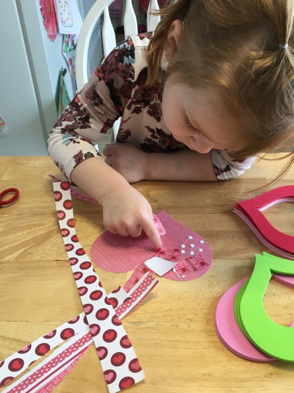 For our valentines, I focused on activities to strengthen fine motor skills in her hands, fingers and wrists. These skills are helpful to strengthen a child’s hands to better prepare them for writing and many other tasks.