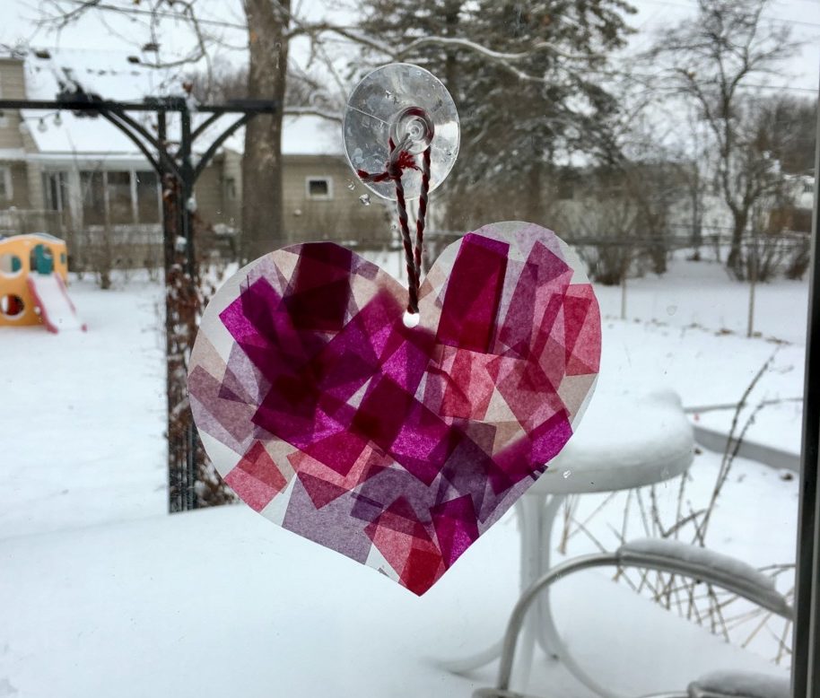 Once you are done trimming the sides, punch a hole in the top of the heart, add a string and you have a pretty little sun catcher!