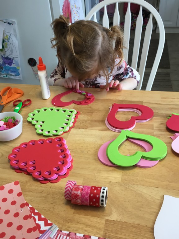 At first, I let E guide our time together. I gave her free reign of the table and she got started right away. She chose the foam hearts first and began gluing the tiny hearts on to a bigger heart frame.