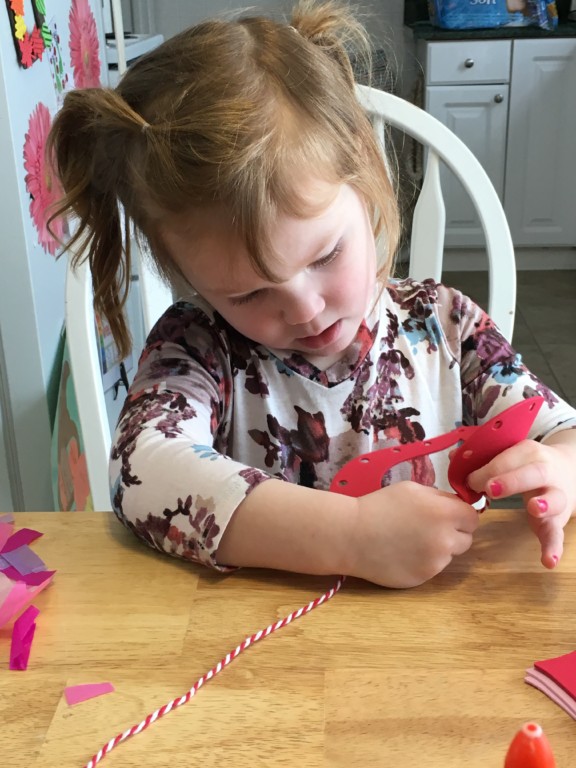 First you need to take your hole punch and punch holes evenly around the perimeter of the heart. Once that is finished lace your string through one of the holes to prepare it for the child. After that, it’s up to them! Remember: the RIGHT way to do this is however the child chooses to! It is their art, allow them to complete it as they wish. Just be there as a helping hand in case the kids have trouble. If they kids have never done this before on their own do a couple of holes as examples and then give them a try. This can be really tricky for teeny hands so really encourage your little through this activity.