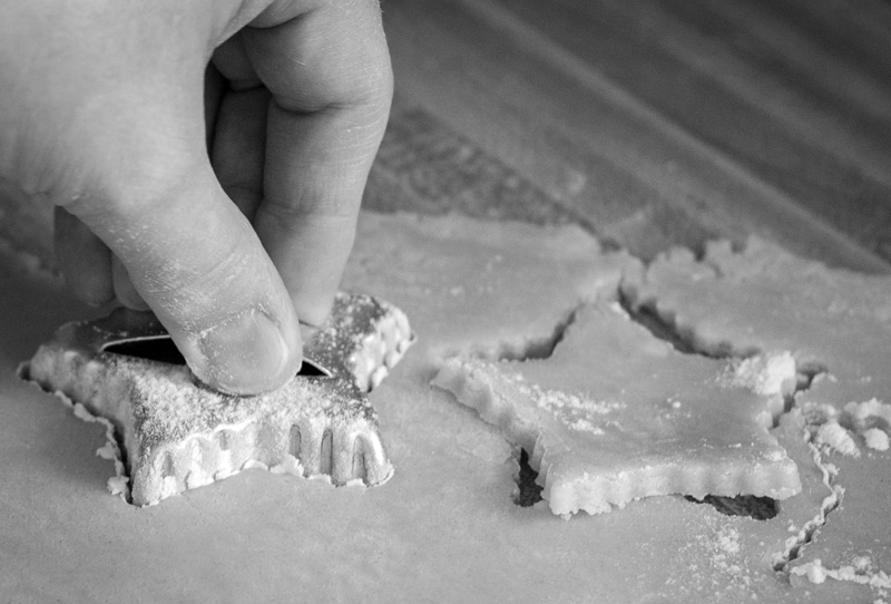 Roll out dough, using plenty of extra flour on your rolling pin & countertop, 1/4″ thick. Cut out shapes, transferring them to parchment-lined baking pans. Re-roll dough and cut out more shapes as desired!