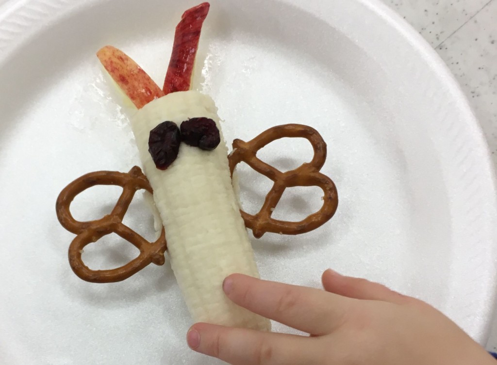 - Butterfly banana – use bananas, pretzels, apples and raisins to make a butterfly {give them the ingredients to create on their own – mama ain’t got time for all that!}