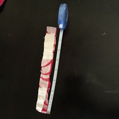 Next, you’ll want to measure your fabric strips. I suggest measuring out one piece and using that as your guide. Each piece cut should be about 8″ long and 1″ wide. This will really give the wreath its fullness. If you have crooked cuts, it’s ok; that’s the whole point of a “rag” wreath!