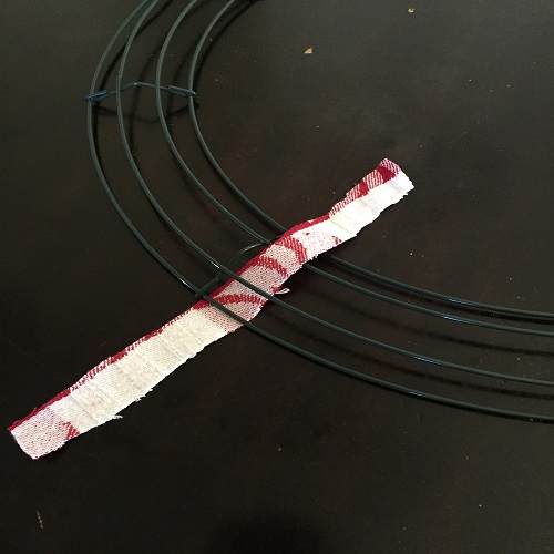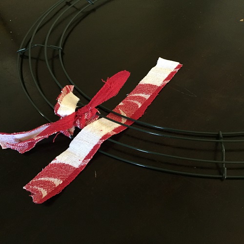 Next, you’ll want to start from the bottom up. There are four circles on each wreath. Thread your fabric under the first two and pull up between the two middle wires. From here, you’ll double knot it. After knotting it, you’ll want to push it as far as you can to the left up next to the divider.