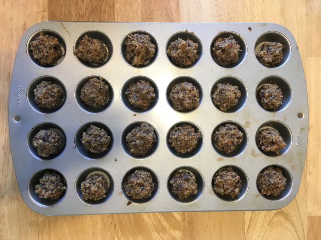 Roll the mixture into 1-inch bites. We use a mini muffin tin to hold the bites as we form them simply because it’s a good way to help our bites stay a consistent size and it’s easier to transfer them to the freezer for the next step.