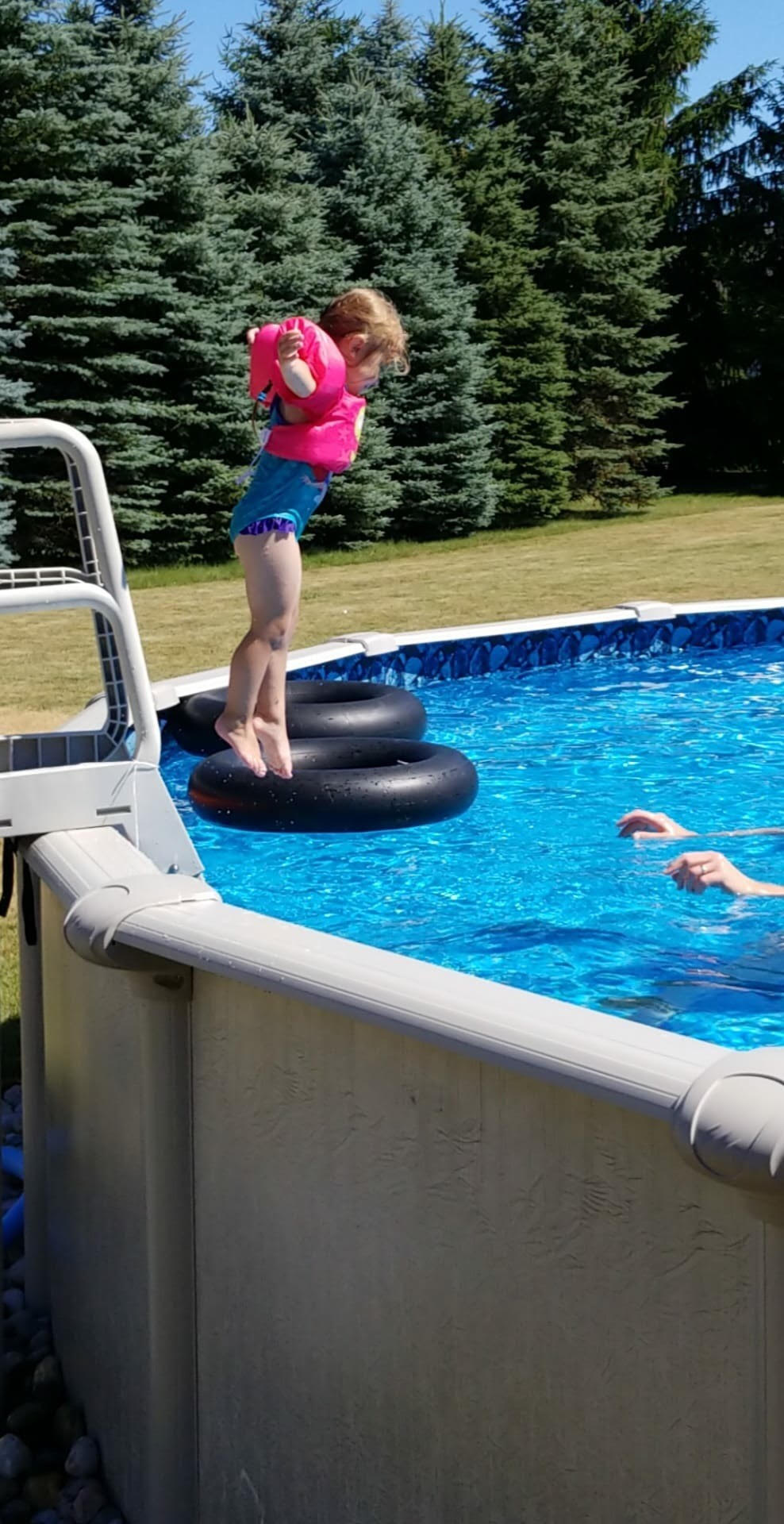 Into the pool we all went, and the girls were getting adjusted right away. This former lifeguard swim teacher was beaming ear to ear. I was so proud and happy to be with family in a pool floating around on a hot summer night. The girls were getting more and more comfortable and my oldest wearing the arm floaties was doing amazing jumping off the side and swimming over to floating toys.