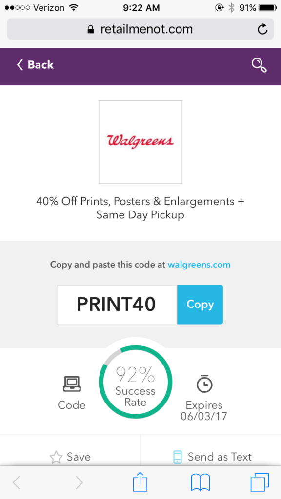 Next, I checked online for any Walgreens promo codes or coupons. And wouldn’t ya know! I found a 40% off for prints. Yes, please!
