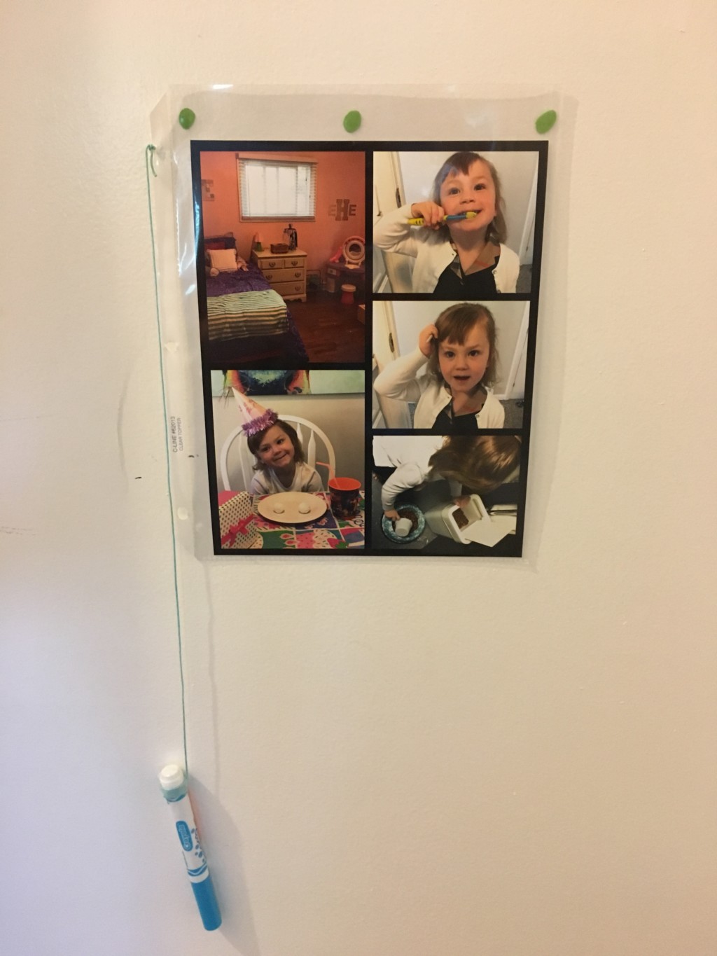 After I picked up the order from my local Walgreens, I slipped the collage into a plastic sleeve paper protector thingy (I believe that’s the technical term..), stuck it to her door, attached a dry erase marker and I was done!