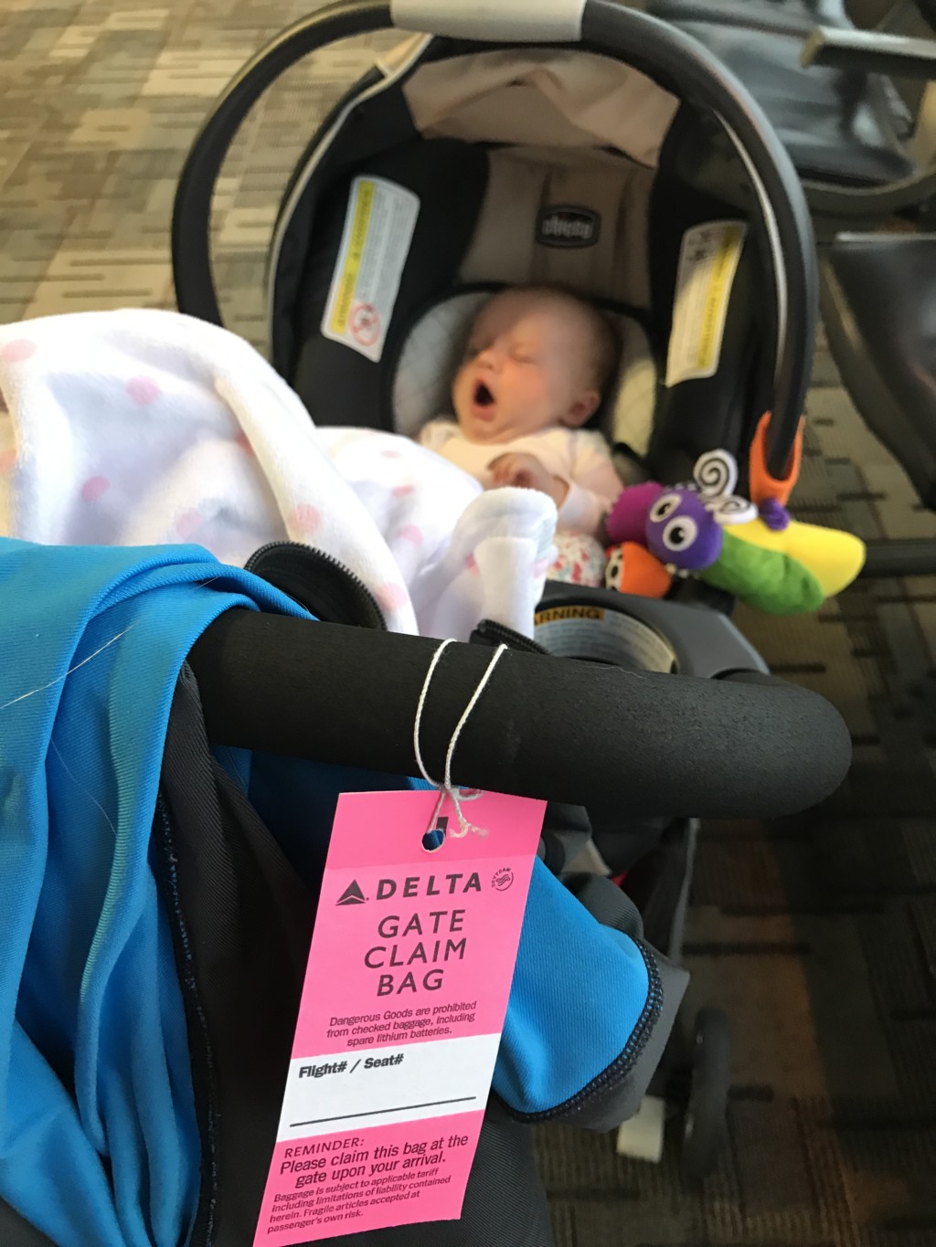 6. Gate-Check – If your kid is not big enough to sprint through an airport, put them in a stroller or a baby carrier. Have you witnessed parents dragging children and baggage through an airport? Does it look like a good time? You can gate check your stroller, which means you literally wheel your kid right to the airplane door, fold it up, leave it, and when you get to where you are going, you wait right outside the plane where they will bring your stroller {and car seat if you have a travel system} right to you. Strap your kid in {because you have two hands from wearing a backpack} and wheel to where you need to be. You get a special tag for gate-check so be sure to visit the counter ahead of boarding as to not cause a hold up in line.